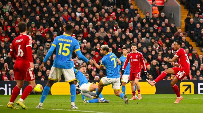 第26分钟,利物浦卷土重来,麦卡利斯特的劲射同样击中立柱,但裁判吹罚基耶萨在门前干扰了若泽萨,越位在先。